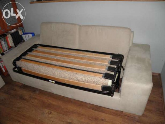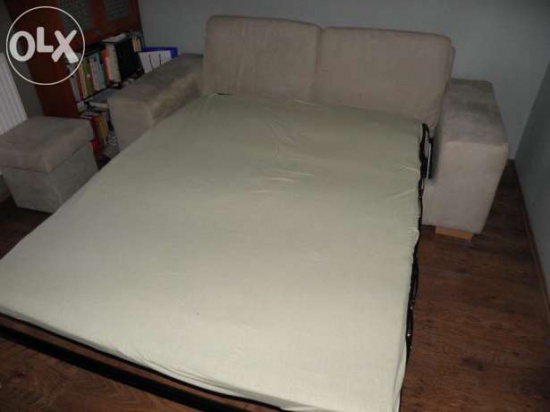 Kanapa wygodnie rozkładana, fotel i 2 pufy